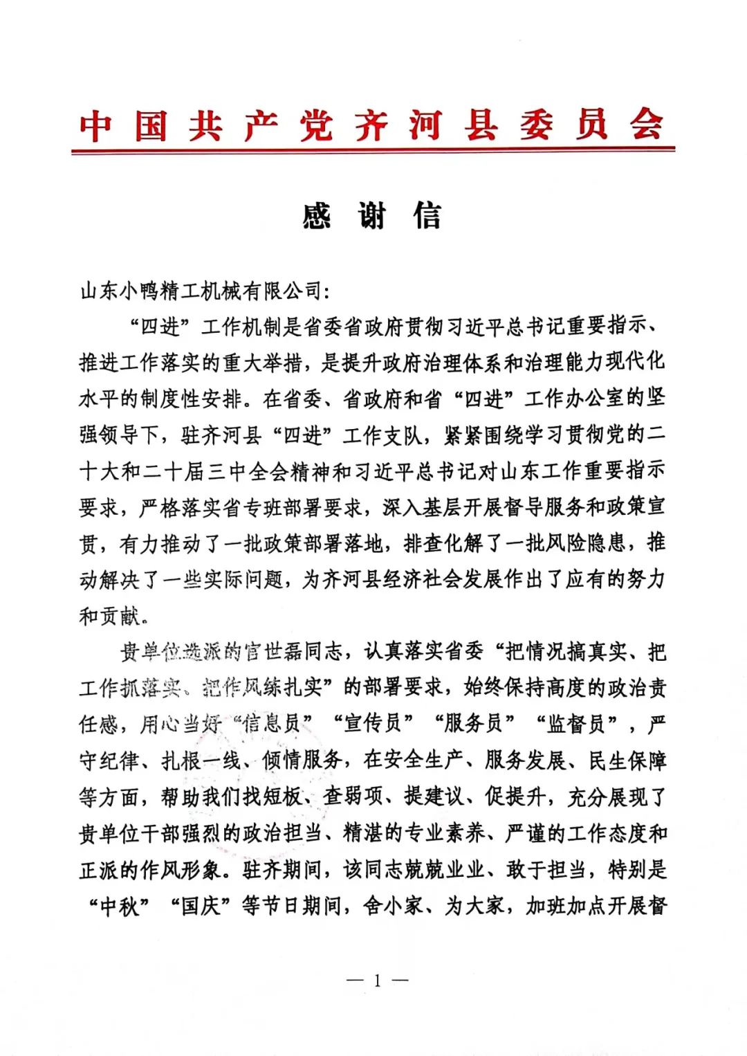 自5月4號(hào)開始,小鴨精工選派干部骨干宮世磊同志到駐齊河縣“四進(jìn)”工作支隊(duì)報(bào)道,開展為期6個(gè)月的省“四進(jìn)”工作。工作期間,宮世磊同志認(rèn)真落實(shí)省委“把情況搞真實(shí)、把工作抓落實(shí)、把作風(fēng)練扎實(shí)”的部署要求,始終保持高度的政治責(zé)任感,用心當(dāng)好“信息員”“宣傳員”“服務(wù)員”“監(jiān)督員”,嚴(yán)守紀(jì)律、扎根一線,傾情服務(wù),在安全生產(chǎn)、服務(wù)發(fā)展、民生保障等方面,幫助齊河縣“四進(jìn)”工作支隊(duì)找短板、查弱項(xiàng)、提建議、促提升,充分展現(xiàn)了小鴨精工人強(qiáng)烈的政治擔(dān)當(dāng)、精湛的專業(yè)素養(yǎng)、嚴(yán)謹(jǐn)?shù)墓ぷ鲬B(tài)度和正派的作風(fēng)形象。為此,齊河縣“四進(jìn)”工作支隊(duì)特寫感謝信一封,感謝公司對(duì)“省四進(jìn)”工作的大力支持,感謝官世磊同志的辛勤付出!